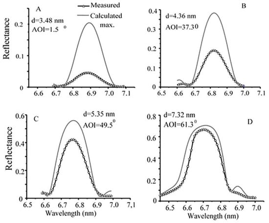La-based PMMs have been shown to possess a greater reflectance than Mo-based PMMs due to their bulk optical properties and are therefore preferred candidates for applications such as EUV lithography, which requires high photon transmission. La/B4C PMMs have also been considered for use in X-ray fluorescence spectroscopy [], particularly for boron detection []. The theoretical reflectivity of La/B-based PMMS is >80% at 6.6 nm but the highest experimentally obtained reflectivity is still significantly lower. Makhotkin et al. prepared La/B PMMs with different periods (7.8–3.2 nm wavelength range) []. In the optical characterization of La/B PMMs, their choice of angle of incidence in respect to the surface normal was made to exhibit the maximum reflectance at 6.8 nm. The measured reflectivity was compared to the calculated maximum reflectivity that is computed for a standard 40 period La/B multilayer without interface roughness, employing the bulk values for La and B densities and the ratio of as-deposited La and B layer thickness. Their results proved that increasing the thickness of the multilayer periods can decrease the difference between the calculated and measured reflectivity, as shown in Figure 7. In addition, they showed that the calculated reflectance values can be achieved experimentally by improving the multilayer interface quality.