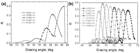 Angular dependence of reflectivity of (a) the La/B4C, and (b) La/B4C/C PMMs taken in the spectral range of 6.6–6.9 nm wavelengths. Reprinted from [] with the permission of AIP Publishing.