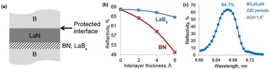 From the above observations, Kuznetsov designed a structure that eliminates the direct contact of N species with the underlying B layer at the LaN-on-B interface. This was achieved by simply introducing an initial delay in lanthanum nitridation. This resulted in a lanthanum interlayer at the LaN-on-B interface. Herein, the chemical interaction of La with the underlying B layer forms a LaBx interlayer. To confirm the response, they modeled the reflectivity of multilayers structures with varying thicknesses of LaB6 interlayers compared to the influence of BN interlayers at the LaN-on-B interface considering effective roughness/diffusion zones of 0.5 nm. The results proved that BN interlayers resulted in a very high reflectivity decrease compared to LaB6 (Figure 9b). Furthermore, the synthesized B\La\LaN (the materials are written in the deposition array) PMMs gave a reflectivity of 64.1% at λ = 6.65 nm taken at 1.5° off-normal AOI, as seen in Figure 9c. The increase in reflectance can be ascribed to forming a more optically favorable LaB6 instead of BN at the LaN-on-B interface.