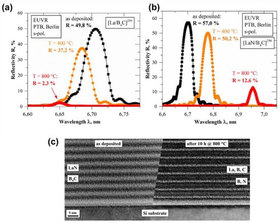 To better understand the effect of thermal stability on PMMs, Naujok and co-workers [] investigated the change in the microstructure and reflective properties of La/B4C and LaN/B4C PMMs prepared for high reflectivity at λ = 6.7 nm and annealed at elevated temperatures ≤800 °C. They analyzed the thermally induced changes in the internal structure of the PMMs, such as the elemental distribution, period thickness, crystallinity, and optical reflectivity. At temperatures ≤300 °C, there was no noticeable change in the period thickness of La/B4C PMMs. However, at temperatures >300 °C, there was a significant decrease in the period thickness. This decrease in period thickness was ascribed to the LaB6 crystallites’ formation and growth. Further investigation proved that the La/B4C multilayer changes to a LaB6/C multilayer after annealing at 800 °C for 10 h. This resulted in a shift in wavelength and substantial deterioration of EUV peak reflectance. In Figure 10, it is shown that the initial reflectivity of 49.8% at λ = 6.7 nm, and 8° AOI after deposition decreased to 37.2% at λ = 6.68 nm after annealing at a 400 °C temperature, and further decreased to 2.3% after 800 °C thermal treatment. The decrease in the optical performance was ascribed to the presence of rougher interfaces as a result of the formation of LaB6 crystallites. In confirmation, they simulated a LaB6/C multilayer considering an average interface width of 0.6 nm, and the reflectivity was shown to be ~3%. For the LaN/B4C PMMs, they reported a linear increase in the period thickness at up to a 600 °C temperature. The period thickness further expanded as the temperature increased. They concluded that the increase in the period thickness results from the formation of amorphous BN at the interfaces of the multilayer. Additional studies confirmed no sign of crystallinity throughout the thermal treatment temperature range, and large amorphous LaBxCy layers were divided by thin amorphous BN layers. Moreover, their observation of LaN/B4C PMMs showed a reduction in reflectivity and significant spectral shift in the peak wavelength, as shown in Figure 10b. The EUV reflectance decreased from the initial value of 57% (λ = 6.7 nm) to 50.2% after a 400 °C annealing temperature. This signifies a 12% reflection loss compared to the 25% loss seen in La/B4C PMMs. In addition, when the annealing temperature was 800 °C for 10 h, the EUV reflectance was shown to be 12.6% (λ = 6.96), corresponding to a 20% loss in reflectance. Interestingly, the researchers previously demonstrated that LaN/B PMMs revealed a 20% reflection loss at a 400 °C annealing temperature. Therefore, LaN/B4C experienced minimal thermally induced reflection loss compared to the La/B4C and LaN/B PMMs.