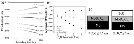 Nyabero et al. [] used pulsed DC magnetron sputtering to deposit 50 period Mo/B4C multilayers onto neatly polished Si substrates. The thickness of Mo layers was 3 nm, and the thickness of the B4C layers was varied from 1 to 4 nm. The samples were annealed up to 300 °C for 48 h to enable significant intermixing, and the physical causes were analyzed. Their studies showed both expansion and compaction of the period thickness of the multilayers. Figure 11a revealed that the PMMs with B4C < 2 nm exhibited compaction, whereas the PMMs with B4C > 2.5 nm showed expansion. Moreover, PMMs with B4C = 2 nm and 2.5 nm expanded initially before showing compaction. These results proved that the change in the period thickness of Mo/B4C PMMs depends significantly on the thickness of the B4C layers and the annealing time. Although they observed intense stress relaxation at the thermal treatment time, as seen in Figure 11b, it was shown that the contribution of stress relaxation to the expansion of the period thickness is negligible. Moreover, on the effect of the interdiffusion of atoms during annealing, in PMMs with B4C ≤ 1.5 nm, the additional supply of Mo into the earlier formed MoBxCy (Figure 11c) interlayer was prevalent, leading to densification, and hence resulting in period thickness compaction. However, for PMMs with B4C ≥ 2 nm, it was reported that the higher diffusion of B and C (the mobilities of B and C atoms are higher than Mo atoms) into the interlayers led to the formation of low-density compounds, resulting in a thickness period expansion.