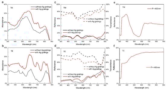 According to the theory of diffraction grating, gratings with periods of 300–800 nm are assumed to have excellent performance in the wavelength range of 300–900 nm, and the performance can be modulated by adjusting various parameters. Here, gratings with a moderate period of 400 nm are taken as an example to study the absorption enhancement effect. Figure 2a,b show the absorptance of NWs for both TM and TE polarized light, respectively. It can be seen that, by introducing gratings, both TE and TM absorption is significantly enhanced over the whole wavelength range. The absorption enhancement is mainly the result of a reduction of transmittance, as shown in Figure 2c,d. For TE polarization, the absorption enhancement is attributed to the diffraction of gratings. The gratings generate a propagating wave vector component along the in-plane direction of the NW axis, resulting in multiple reabsorption of light by NW. For TM polarization, the diffraction effect of gratings is weaker, which can be seen from the reflectance of diffracted light for TM and TE polarized light, as shown in Figure 2e,f. Correspondingly, the absorption enhancement for TM polarization is lower than that for TE polarization. Another possible factor contributing to the absorption enhancement for TM polarization is the surface plasmon polaritons (SPPs) [28,29,30]. SPPs can be excited at the interface between air and silver, which propagate along the interface and scatter into free-space mode at the edge of the grating. The scattered light and propagated SPPs can transfer energy to the NW, leading to the light absorption enhancement.