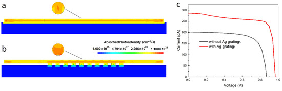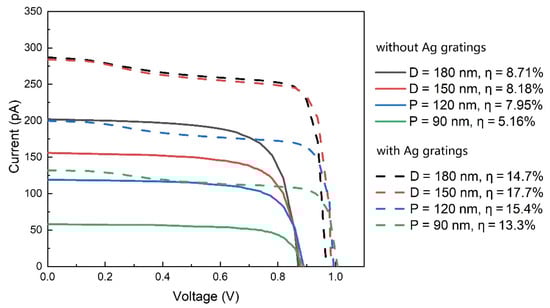 Figure 3c shows the current–voltage characteristics of NWs without and with Ag gratings, which directly represent the electrical performance of solar cells. After introducing the gratings, the short-circuit current significantly increases from 202 pA to 287 pA, and the open-circuit voltage rises from 0.87 V to 0.968 V, resulting in a remarkable efficiency promotion from 8.71% to 14.7%. The increase in short-circuit current is attributed to the absorption enhancement induced by Ag gratings, as shown in Figure 2. The improvement of the open-circuit voltage is associated with the suppression of recombination loss of carriers [32], as shown in Figure 3b.