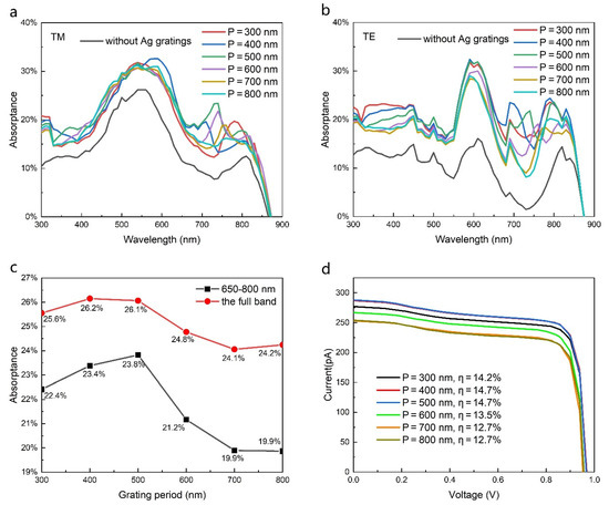 In order to further explore the absorption enhancement mechanism of gratings, the absorptance of NWs with gratings for periods of 300–800 nm was studied, as shown in Figure 4a,b. For TM polarized light, the introduction of gratings generates a new absorption peak at 650–800 nm. With the increase in the grating period, the position of the absorption peak is redshifted, and the value of the peaks first increases and then decreases. This is attributed to the excitation condition of SPP. With the increase in grating period, the excitation wavelength of SPP gradually increases. When the grating period is 500 nm, the new absorption peak value reaches its maximum, and the peak position coincides with that of the absorption trough without gratings. This means that a grating period of 500 nm is optimal for TM polarized light absorption. The reason for this phenomenon is that when the light irradiates the surface of the metal gratings, the incident light interacts with the metal gratings and is coupled to the slit of the gratings, before being coupled to the NW through the slits to enhance its absorption [33]. The wave vector matching condition [34] for exciting the SPPs is