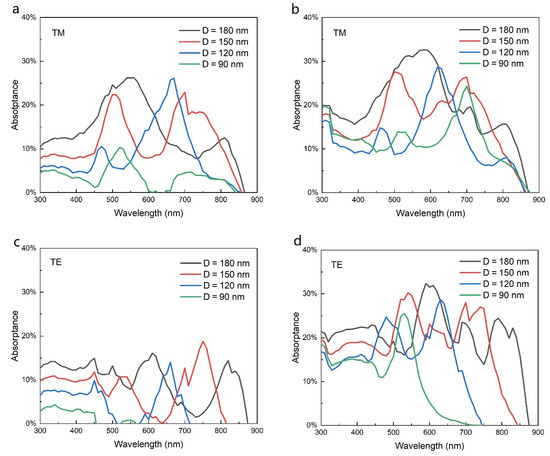 Studies have shown that the light absorption of NWs strongly depends on their diameters [10,35,36]. Figure 5 shows the absorptance of NWs with different diameters for TM and TE polarized light. Generally speaking, as the diameter increases, the absorption peak of NWs exhibits a redshift, which is attributed to the optical resonance mode in the NW cavity that causes strong absorption at a specific wavelength [37,38]. However, the absorptance of 90 nm diameter NW does not conform to this rule, which is attributed to the partial loss of optical resonance mode. Figure 5a,b show the diameter-dependent absorptance of NWs without and with Ag gratings for TM polarized light, respectively. As the diameter decreases, the absorption at long wavelength drops, especially in the 700–870 nm range. After the introduction of gratings, the absorption at long wavelengths is improved for NW with all diameters, particularly for an ultrasmall diameter of 90 nm. The excitation of SPPs plays a dominant role in the absorption enhancement of an ultrathin NW, which enables it to support more resonance modes. For TE polarization, due to the diffraction limit of light, an absorption cutoff wavelength is observed for thin NWs without gratings, which exhibits a blueshift as the diameter decreases, as shown in Figure 5c. For the NW with diameter of 90 nm, the absorption cutoff wavelength is about 570 nm, resulting in a huge loss of incident light. After the introduction of gratings, the absorption cutoff wavelength is extended, as shown in Figure 5d. For the NW with a diameter of 90 nm, the cutoff wavelength is significantly extended to 730 nm. This is because the diffraction of gratings significantly improves the confinement of long-wavelength modes for ultrathin NWs [10]. The enhancement of absorption intensity and the expansion of absorption wavelength range induced by gratings are particularly promising for the development of ultrathin high-performance solar cells.