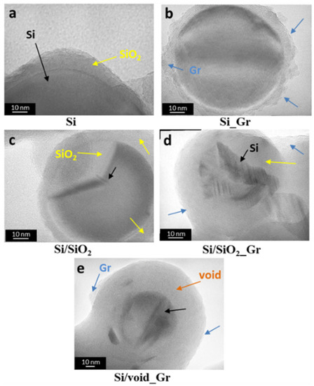 TEM images of the different silica nanoparticles-based samples listed in Table 1, of (a) Si, (b) Si _Gr, (c) Si/SiO2_Gr, (d) Si/SiO2_Gr, and (e) Si/void_Gr.