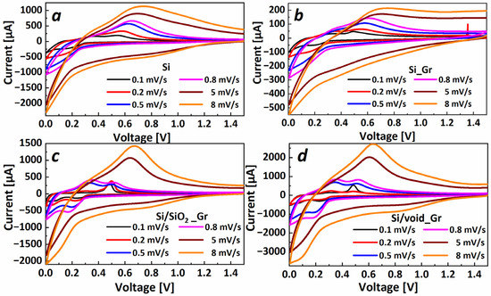 Figure 5 shows the cyclic voltammograms for the electrodes Si, Si_Gr, Si/SiO2_Gr, and Si/void_Gr. The cell with Si electrode, at the slowest scan rate, exhibits two cathodic peaks (Figure 5a), the first at ~200 mV corresponding to the lithiation phase of the amorphous Li7Si3 to the amorphous Li3.16Si, and the second peak at the end of lithiation, in our case 5 mV, where the lithiation phase is shifting from the amorphous Li3.16Si to crystalline Li4.25Si [51]. At the delithiation (anodic branch), we can observe the two equivalent peaks, one at ~375 mV which corresponds to the phase transition from amorphous Li3.16Si to amorphous Li2.3Si and the second broad anodic peak at ~540 mV which corresponds to amorphous Li2.3Si to amorphous Si. With increasing scan rate, the two cathodic peaks appear less distinctive and the anodic peak at 300 mV seems to be suppressed compared to the peak at 540 mV. Especially for the second anodic peak (at 540 mV in the case of 0.1 mV/s), it is observed that with increasing scan rate, the peak shifts toward positive potential values; for 0.8 mV/s rate, as compared to 0.1 mV/s, the peak has shifted more than 100 mV due to electrode kinetics [52]. Similar behavior can be seen for the Si_Gr electrode, in Figure 5b, with the difference to the Si sample, that all corresponding peaks appear at lower potentials of around 50 mV, which is mostly due to the higher electron conduction within the electrode provided by the addition of graphene. This is also supported by the higher discharge capacity of the Si_Gr electrode compared to the Si electrode during the first galvanostatic cycle (Figure 4a). Finally, in the case of high scan rates, a high cathodic current within a potential range between 0.6 V and 1 V is an indicator of electrolyte decomposition and SEI generation. From the cycling performance of those electrodes, the large capacity fading versus cycling is demonstrated.