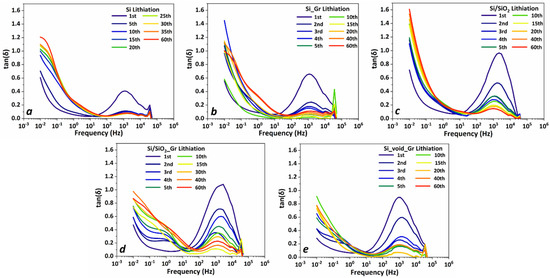 Loss tangent spectra, at the end of each lithiation cycle, for lithium half cells with cathodes of (a) Si, (b) Si_Gr, (c) Si/SiO2, (d) Si/SiO2_Gr, and (e) Si/void_Gr.