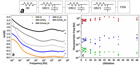 (a) Electrical response model for the description of the tan(δ) data composed by a resistance in series with three distributed RC elements and a finite space Warburg element. (b) representative fitted curves (continuous lines) for the impedance data after the 40th lithiation. (c) Characteristic frequencies of the three peaks from tan(δ) spectra for Si (rhombi), Si_Gr (open circles), Si/SiO2 (squares), Si/SiO2_Gr (triangles), and Si/void_Gr (filled circles).