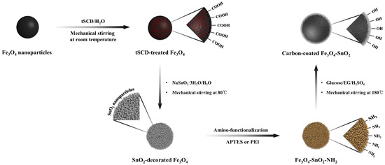 The fabrication of SnO2-decorated Fe3O4 composites through facile surface modification has been reported [24]. Fe3O4 nanoparticles were carboxylated using polyacrylic acid (PAA) or tri-sodium citrate dihydrate (tSCD), and the surface modification method using tSCD was more effective than that using PAA. The results demonstrated the feasibility of the preparation of spherical nanoparticles surrounded by ultrafine SnO2 nanoparticles. Motivated by these results, in this study, we prepared Fe3O4-SnO2-C composite particles with a three-layered core–shell structure through the dehydration of glucose under atmospheric pressure (Figure 1). Fe3O4-SnO2 nanoparticles were amino-functionalized using a polymeric precursor, PEI, and a silane precursor, APTES. Subsequently, the effects of the functionalizing amine groups on the structure of the multilayered particles were investigated. In addition, the mechanism underlying the formation of the core–shell structure by the reaction between the polymerized layer formed by combining glucose, a monosaccharide-based carbon precursor, and the aminated nanoparticles and sulfuric acid was investigated.