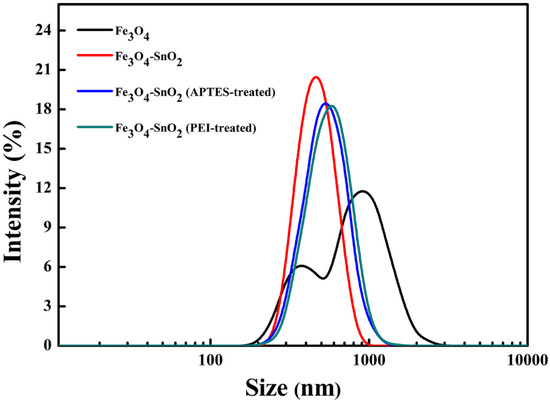 Figure 3 shows the particle size distributions of the as-prepared Fe3O4, Fe3O4-SnO2, APTES-treated Fe3O4-SnO2, and PEI-treated Fe3O4-SnO2 nanoparticles in distilled water. The distribution curve of the Fe3O4 nanoparticles showed a bimodal shape with a wide size distribution range of 200–2650 nm and a mean size of 821 nm. This can be attributed to the presence of particles aggregated because of the high surface energy generated at the nanoscale and the low surface charge of the Fe3O4 nanoparticles [31]. In contrast, the surface-decorated/functionalized nanoparticles exhibited monomodal curves. The measured mean size distribution values of the Fe3O4-SnO2, APTES-treated Fe3O4-SnO2, PEI-treated Fe3O4-SnO2 nanoparticles were 476, 551, and 578 nm, respectively. In the case of the Fe3O4-SnO2 nanoparticles, the hydroxyl groups present on the SnO2 surface generated a high surface charge, improving the dispersibility of the particles in the solvent. On the other hand, the APTES- and PEI-treated Fe3O4-SnO2 nanoparticles showed relatively low surface charge, and thus showed slightly lower dispersibility than the unfunctionalized Fe3O4-SnO2 nanoparticles.