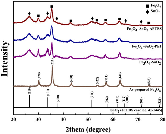 XRD patterns of the as-prepared Fe3O4, Fe3O4-SnO2, PEI-treated Fe3O4-SnO2, and APTES-treated Fe3O4-SnO2 nanoparticles.
