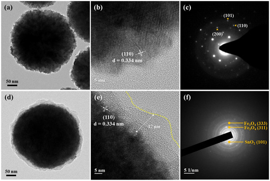 HRTEM images and SAED patterns of (a–c) the PEI-treated Fe3O4-SnO2 and (d–f) APTES-treated Fe3O4-SnO2 nanoparticles after the carbon coating process.