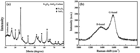 XRD patterns (a) and Raman spectra (b) of the Fe3O4-SnO2-C composite nanoparticles.