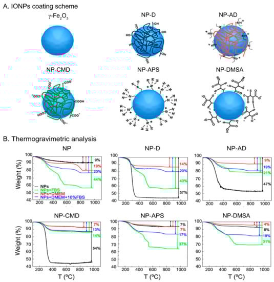 (A) Scheme illustrating the IONPs with the different coatings: NP (γ-Fe2O3), NP-D (dextran), NP-AD (amino-dextran), NP-CMD (carboxymethyl-dextran), NP-APS (aminopropyl-trietoxy silane), NP-DMSA (dimercaptosuccinic acid). (B) TGA measurements of IONPs suspended in different media, water (black), FBS (green), DMEM (red), and DMEM (10% FBS) (blue).