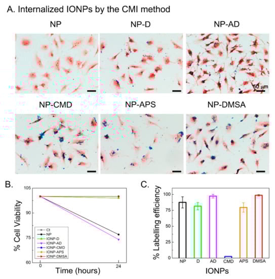 The internalization of IONPs into cells is strongly influenced by their coating and colloidal properties [], but also by other parameters such as IONPs sterilization and suspension media []. In order to evaluate the role of the different coatings, we have used the same IONP core with the above five different coatings to assess their CMI-mediated internalization capabilities. We first resuspended the IONPs in DMEM supplemented with 10% of FBS and used a filter as the sterilization procedure. Surprisingly, after carrying out the CMI method, we observed from optical microscopy images of Prussian blue staining, that only two types of IONPs’ coatings (AD and DMSA) were able to cross the cellular membrane into the cytoplasm (Figure S2A). We speculated that these results might be due to their higher Dhyd (AD: 561 nm; and DMSA: 335 nm) compared with the other IONPs.