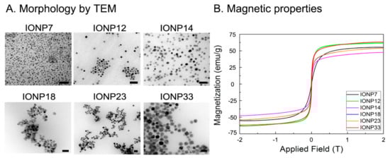 (A) Morphology characterization by TEM and (B) magnetic characterization by VSM of all IONPs with different core sizes. Scale bar: 50 nm.