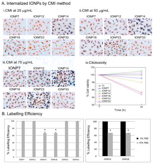 With IONP14 and IONP18 suspended in DMEM 10% FBS, low internalizations by CMI were observed because of their small Dhyd. Therefore, IONP14 and IONP18 were employed in DMEM only, while the remaining IONPs were suspended in DMEM + 10% FBS. Figure S3 shows the optical images after Prussian blue staining at different initial IONP23 concentrations. Agglomerates appeared on the cell surface concentrations using 100 and 125 µg/mL. Therefore, 25, 50 and 75 µg/mL of initial concentration were used to favour internalization. Figure 4A shows optical images of U373 cells incubated with IONPs at different concentrations using the CMI method and after Prussian blue staining. At 25 µg/mL, only IONP14 and IONP18 were internalized (Figure 4A) (i). At 50 µg/mL, only IONP7 and IONP23 were unable to undergo internalization (Figure 4A) (ii). Finally, at 75 µg/mL, IONPs underwent internalization and labelled the cells (Figure 4A) (iii). Resazurin assay indicated no toxicity using any of the IONPs by CMI after 24 h at an initial concentration of 75 µg/mL (Figure 4A) (iv).
