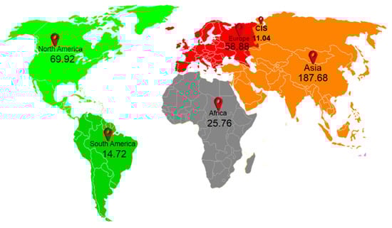 Plastics are synthetic materials made up of polymers, which are long molecules around chains of carbons atoms, especially hydrogen, nitrogen, oxygen, and sulfur [,]. Plastics can be categorized based on their size, i.e., microplastics (>25 mm), mesoplastics (5–25 mm), microplastics (MPs) (0.1–5 mm), and nanoplastics (NPs) (<100 nm) []. Overall, worldwide plastic production is approximately 6300 million tons, of which 79% is deposited in landfills and other ecological segments []. In 2019, global plastic production was 368 million tons; 114.08 million tons of plastic were produced only in China and 58.88 million tons only in Europe, as shown in Figure 1, and its capacity is expected to double in 2040 [,,].
