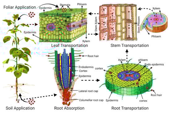 Plants can uptake or adsorb MPs and NPs in the form of aggregates []. Transpiration pull plays a major role in the plant uptake and translocation of plastic particles. According to Li et al.’s [] findings, plastic particles enter the epidermal tissue of wheat’s primary and secondary roots and are stimulated through the pericycle and moved into the xylem. Inside the central cylinder, these particles, through the xylem, can move to the aerial part of the plant, as shown in Figure 3. Plastic particles were transferred from root to shoot by the vascular system via the transpiration stream. Confocal images confirmed that plastic luminescence signals were traced mainly in the vascular system of the stem. MPs and NPs can travel in microscopic extracellular channels and reach the vasculature accountable for water transportation []. Water transportation system supporting NPs can quickly transfer to the stem, leaves, and possibly fruits. Recently, Lian et al. [] revealed plastic NP uptake and translocation in wheat crops. Confocal microscopy with 3D laser scanning clearly showed that root tips take up PS NPs while for PS NPs in leaves, the fluorescent signal was shielded by the auto fluorescence of plant tissues. Similarly, PS NPs that absorbed in root and shoot xylem were also detected by SEM. PS NPs (100 nm) could be transmitted from root to shoot via the xylem pathway, which may possibly be transported into the grain. Bosker et al. [] found clusters of plastic particles in the leaf and epidermis of Lepidium sativum through epifluorescence and confocal microscopy after 48 and 72 h of exposure with MPs. The PS beads (0.2) were observed by the SEM in the wheat’s outer side of the cell walls in the stem xylem and also detected in the intercellular space of lettuce leaf veins. Li et al. [] confirmed that PS NPs and MPs can accumulate in the stem and leaves tissue of the cucumber plant; 500-nanometer and 700-nanometer MP particles were observed in the first fruit interspace tissue of a calyx cross-section. They also suggested, based on the results, that PS NPs can accumulate in the flowers and fruits of cucumber plants.