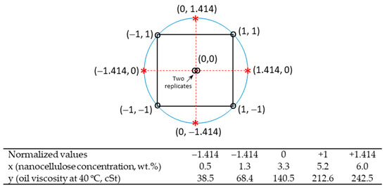 Box–Wilson Central Composite design based on a circumscribed central rotatable matrix, showing the correspondence between normalized values (levels) and actual values for the two variables (factors) of interest (nanocellulose concentration, x, and oil viscosity, y).