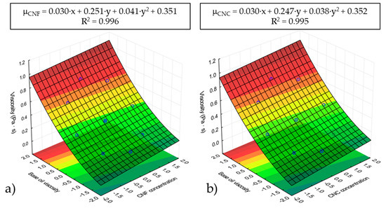 It is worth pointing out that the similar viscosity improvement reached with both nanocelluloses could be attributed to their similar molecular structure. Essentially, they only differ in aspect ratio, which does not seem to affect the viscous flow behavior too much. Consequently, the remarkable increase in viscosity when castor oil was used as the base oil may most probably be attributed to intermolecular H-bonding between the −OH groups present in the nanocellulose particles and those pending from the C12 at the ricinoleic fatty acid of castor oil [35,36]. Figure 2 shows the response surface of dynamic viscosity, at 25 °C, for both nanocelluloses studied as a function of normalized values of nanocellulose concentration (x) and base oil viscosity (y). Regardless of the nanocellulose type, similar fitting functions were observed. A fairly good regression of the experimental data was obtained. Dynamic viscosity was found to have a quadratic dependency on base oil viscosity (y) and a slight linear dependency on nanocellulose concentration (x).