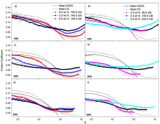 Stribeck curves for CNC-based dispersions, at 25 °C, as a function of nanocellulose concentration (a,c,e) and base oil viscosity (b,d,f) at 10, 20 and 40 N (first, second and third rows, respectively). Neat base oils are included for the sake of comparison.
