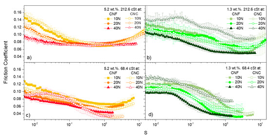 Comparison of the friction coefficient as a function of applied normal force for CNF-based (filled symbol) and CNC-based (empty symbol) ecolubricants, at 25 °C, at selected combinations of base oil viscosity and nanocellulose concentration: (a) 5.2 wt.% and 212.6 cSt; (b) 1.3 wt.% and 216.6 cSt; (c) 5.2 wt.% and 68.4 cSt; (d) 1.3 wt.% and 68.4 cSt.