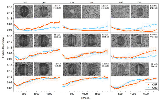 In general, both nanocelluloses studied showed friction-reducing capacity and, under the working conditions used in Figure 3 and Figure 4, both of them seemed to perform equally well. They might accumulate within the solid asperities, thereby efficiently reducing the actual contact area between the solid bodies [7]. Moreover, there seems to be a threshold nanocellulose concentration of around 3.3 wt.%, from which the lubricant exhibited noticeably enhanced friction-reducing performance under solid friction conditions.