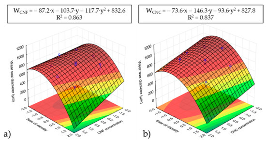 Response surface analysis (RSM) based on wear scar diameters for CNF (a) and CNC (b) ecolubricants.