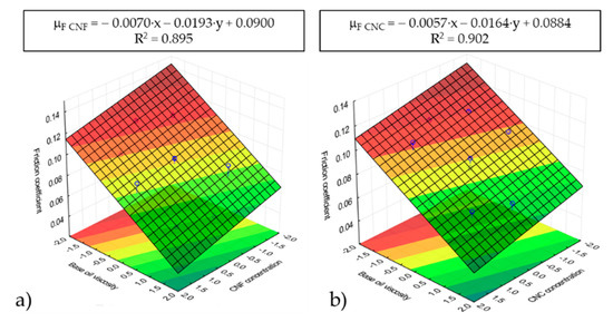 Response surface analysis (RSM) based on friction coefficients for CNF (a) and CNC (b) ecolubricants.