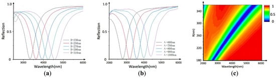 VO2 film in its insulator phase. (a) Change in the reflectance spectrum versus different values of radius R. (b) Change in the reflectance spectrum versus the wavelength of the optical switch with disk duty ratio f = 0.3, where the reflectance is calculated for Al nano-disks with different values of the period Λ (where Λ = 600, 700, 800, 900, and 1000 nm). dVO2 = 50 nm. (c) Reflection spectra of the optical switches with different radii.