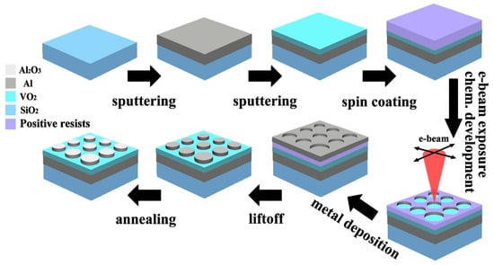 Although we only study from the perspective of simulation, the experimental feasibility is also analyzed. Figure 5 shows the preparation process of the optical switch based on the magnetron sputtering technique and the electron beam lithography. Firstly, the Al and the VO2 films can be fabricated by sputtering the related materials on the SiO2 substrates in turn. Secondly, a layer of photoresist was coated on the films and exposed, developed by the electron beam lithography to form the periodic nano-disks, and the Al nano-disks can be fabricated by successively sputtering Al on the photoresist strip array. Then, the remaining photoresist was removed by the lift-off method. In addition, the protective cap layer of Al2O3 was obtained through the oxidation of the Al nano-disks array.