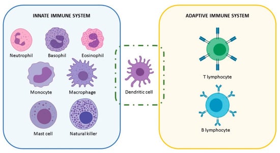 The immune system of higher vertebrates encompasses a collection of different specialized cells and specialized soluble molecules distributed throughout the body, being present in all organs and tissues, circulating in blood and lymph (to reach every corner of the body in case of need), and concentrated in some lymphoid organs (lymph nodes, spleen, bone marrow, where hematopoiesis takes place in adult life). These cells have been classified into two functional branches, namely innate and the adaptive immunity, which have different roles, complementing each other very efficiently in complex organisms such as mammals (simpler organisms such as invertebrates only display a perfectly efficient innate immunity). The innate immune system’s role is to scan the body to remove apoptotic bodies, cell debris, and protein aggregates; recognize and eliminate pathogens or abnormal cells; and keep commensals outside tissues. Additionally, it promotes the repair of damaged tissue and is involved in the control of embryogenesis and delivery. We can say that the innate immune system is the actual immune system, active throughout evolution with conserved and very efficient defensive mechanisms. The other system, adaptive immunity, developed much later as a complement of innate immunity, providing slower but more specific protective responses, good for long-living and mobile organisms that do not stably reside in the same environment []. The adaptive immune responses are tools for the innate immune system with subordinated or programmed functions—tools because they develop without making any decision []. It is the innate immune system that detects, categorizes, and triggers the immune response and, in the case of additional needs, calls for adaptive immunity to come in when the innate activation has reached a certain threshold level indicative of excessive danger and the need for more specific defensive tools.