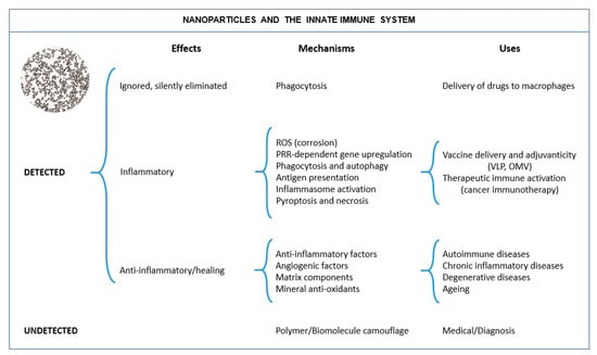 NP-immune system interactions. NPs can be undetected or detected by cells of the immune system, depending on different parameters such as their size, surface charge, and hydrophobicity/hydrophilicity of the surface coating. If detected, NPs can be either tolerated (either ignored or eliminated in a silent fashion, i.e., without inducing an inflammatory reaction) or generate an inflammatory response allowing for resolution of inflammation and tissue regeneration or an anti-inflammatory. With a proper NP design, these responses can be harnessed for developing different immunomodulating activities for medical exploitation (e.g., self-adjuvanted vaccines based on virus-like particles (VLPs), or outer membrane vesicles (OMVs), etc.).