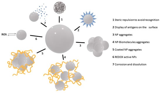Many reports show that NPs may induce harmful immune responses and toxicity. NPs can induce an inflammatory immune activation because of aggregation or dissolution or because they accidentally carry immune-activating moieties (such as endotoxin, detergents, allergens, or cationic molecules). These biological effects are rather independent of the composition, size, or shape of the individual NP, described as extrinsic factors of NP toxicity []. Similarly, the organization of molecular epitopes in a non-conventional form (upon adhesion of the NP surface) may generate new antigens or allergens. The activation of the immune system induced by NPs can be classified as follows: