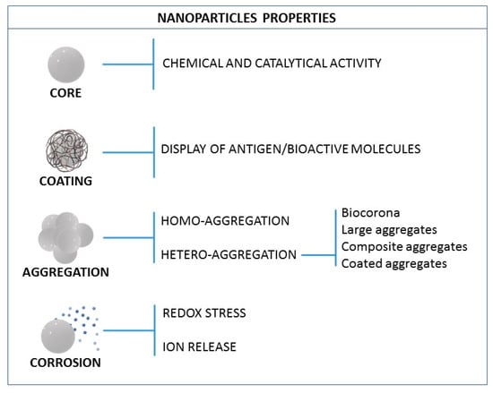 After considering the different interactions NPs may have with the immune system, one can draw indications on how NPs have to be designed to control these interactions and consequent responses. Indeed, while many NP functions can be attributed to their core structure, the surface coating defines much of their bioactivity. By controlling the nano-bio interface, NPs can be designed to be safe and innocuous or active and have therapeutic benefits. From the NP point of view, and for the nanochemist and the nanoengineer, the NP immunological properties can be summarized as depicted in Figure 4. The composition of the NP core determines its chemical potential and catalytic activity, while the surface coating largely determines its bioactivity. NPs can aggregate, either with other NPs or with macromolecules present in the physiological media (e.g., biocorona), or they can dissolve, being redox-active and acting as an ion reservoir, consequently increasing the levels of oxidative stress.