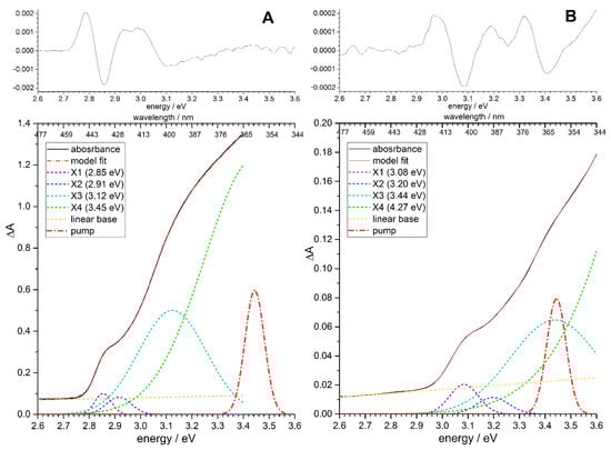 The peak positions ωk and the widths wk of the unshifted Gaussian functions  are usually taken from the decomposition of the X1, X2, and X3 bands in the linear absorption spectrum. Because the X2 and X3 bands comprise combinations of several transitions and their bleach and induced absorption features essentially overlap in the TA spectra, we simplified Equation (2), confining ourselves to the linear term of the expansion of G2(ω − ω2 + Δ2) and G3(ω − ω3 + Δ3) in the Taylor series:
