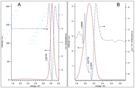 PL spectra of undoped QD-1 (A) and Mn2+-doped QD-2 (B) samples. The PL spectra (red solid lines, left y-axis) are compared with the second derivatives of spectra (blue dash-dotted line, right y-axis).
