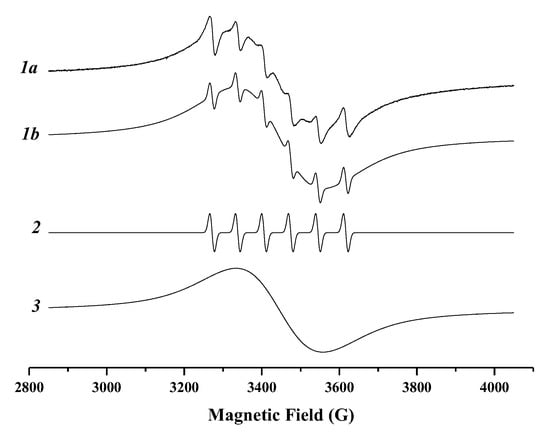 The EPR spectrum of Mn2+:ZnS:CdS/Zns nanoparticles measured at 293 K: 1a—the experimental spectrum, 1b—the sum of the 2 and 3 simulated spectra.