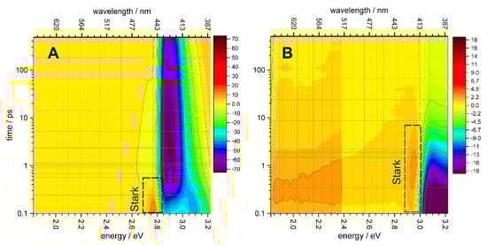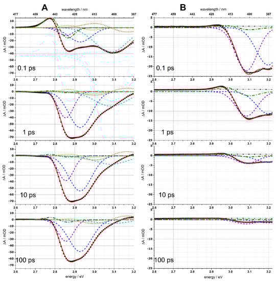 resulting in a quasi-continuous spectrum with the local smoothness determined by the Tikhonov–Phillips regularization. In contrast to a global fitting analysis, the CONTIN program determines the characteristic times of the observed relaxation processes independently at each probing frequency ν and can in principle determine how many processes are observed at different probing frequencies []. This is important for the analysis of coherent hot multi-exciton relaxation, which may proceed by several parallel channels. The results of CONTIN analysis are presented in Figure 6 in the form of spectrograms displaying the aν,k distribution in the energy range between 2.5 and 3.3 eV. The absorption increase or decrease (negative or positive aν,k in Equation (1)) is shown in red or blue in Figure 6, respectively.