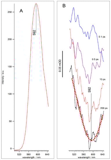 Figure 5 shows the TA spectra of the QD-2 sample at different delays in the spectral domain around to Mn2+(4T1-6A1) transition. The negative peaks close to 590 nm can be tentatively attributed to the stimulated emission (SE) bands of Mn2+(4T1-6A1) (Figure 5B). The positions of the SE(592) band and the Mn2+(4T1-6A1) photoluminescence band coincided, as shown in Figure 5A. This coincidence suggests that the SE(592) band is associated with the luminescence of manganese. The wide positive background for the SE band can be attributed to the excited state absorption of charge carries in traps []. The SE(592) band in Figure 5B was detected at the sensitivity limit. The weak intensity of the SE(592) band is due to the small value of the transient dipole moment of the 4T1-6A1 transition. Weak SE(592) signal makes it difficult to quantitatively analyze the kinetics of manganese luminescence development. For this reason, in this work, we carried out a detailed analysis of the TA spectra in a wide spectral range for QDs doped and not doped with manganese.