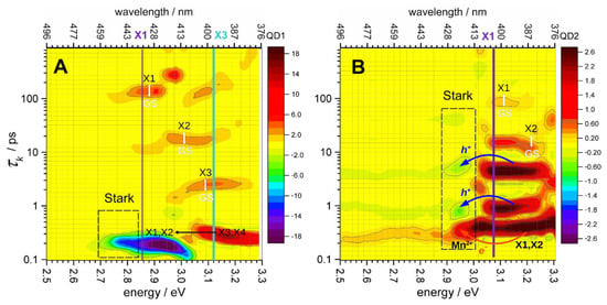 Distribution of the kinetic exponential components calculated by inverse Laplace transform of the TA dynamics of QD-1 (A) and QD-2 (B) in the range of 2.5–3.3 eV using the CONTIN program []. The amplitudes of the kinetic components are shown as colored bars. The Stark shift regions are indicated by dashed-line boxes, and the X1 and X3 peaks are marked by vertical lines. The red arrow in Figure 6B refers to the presumable process of Mn2+ → Mn1+ reduction, whereas the blue arrows mark the processes of Mn1+ oxidation and formation of the excited [Mn2+]* in the 2 inhomogeneous Mn2+ locations.