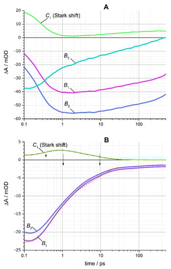 Here G′k(ω − ωk) are the first derivatives of Gk(ω − ωk), which correspond to the spectral features of the Stark shifts of X2 and X3; the positions of the peaks ωk and the widths wk of the Gaussian functions Gk were determined from the decomposition of the linear absorption spectra into Gaussians (see Figure 1 and Table 1, Figure S4); the amplitudes Bk(t) and Ck(t), corresponding to bleaching and Stark shift features, respectively, were found using linear least-squares regression of the TA spectra in the entire time range shown on the TA colormaps in Figure 5. The magnitude of the electrochromic shift δ1 of the band-edge exciton was found as a single parameter for the entire matrix of TA spectral changes by nonlinear minimization, as described previously [,]. Figure 7 shows the fitting of the TA spectra by Equation (3) for several selected delay times. The amplitudes of bleach peaks B1(t), B2(t), and B3(t) can be assigned to the populations of the three predominant exciton states 1Se − 1S3/2, 1Se − 2S3/2, and 1Pe − 1P3/2, respectively []. The dynamics of the B1,2,3(t) bleach peaks amplitude and the C1(t) amplitude associated with the electrochromic Stark shift of the band-edge exciton obtained as a result of the simulation are shown in Figure 8.