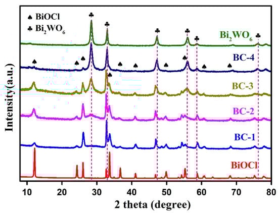A series of Bi2WO6/BiOCl heterojunctions with different weight percentages of Bi2WO6 (13%, 25%, 47%, and 75%) were prepared under the identical experimental conditions and denoted as BC-1, BC-2, BC-3, and BC-4, respectively. Pure Bi2WO6 was also fabricated through the same process with Bi(NO3)3•6H2O instead of BiOCl.