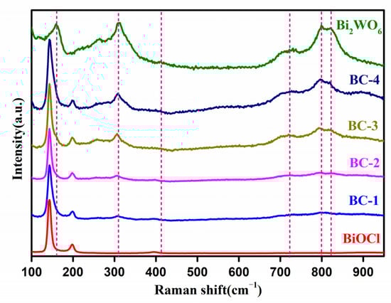 Raman spectra of BiOCl, Bi2WO6, and Bi2WO6/BiOCl nanocomposites.