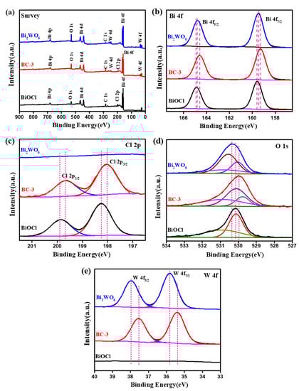 The XPS spectra of the samples are illustrated in Figure 5. As exhibited in Figure 5a, the survey scan spectra indicate that BC-3 nanocomposites are mainly composed of Bi, O, Cl, and W elements. From the Bi 4f spectra of pure BiOCl (Figure 5b), the peaks of Bi 4f5/2 and Bi 4f7/2 at 164.9 and 159.6 eV indicate bismuth existed in the form of Bi3+, respectively [13,34]. Notably, the Bi 4f7/2 and Bi 4f5/2 in the BC-3 nanocomposites were located at about 164.6 and159.3 eV, respectively [35,36]. These shifts can be attributed to the chemical bonding actions among the components. The Cl 2p3/2 and Cl 2p1/2 in BiOCl (Figure 5c) were located at 198.2 and 199.9 eV, which are characteristic positions of the Cl− [11,28]. These peaks changed to 198.0 and 199.7 eV after the construction of the Bi2WO6/BiOCl heterojunction, respectively. The XPS spectrum of O 1s in BiOCl (Figure 5d) displayed peaks at 531.0 and 530.1 eV, attributed to the lattice and surface oxygen [35,37,38]. Additionally, the O 1s spectrum of BC-3 nanocomposite was divided into three peaks at 531.0, 530.1, and 529.8 eV, corresponding to Bi-O, W-O, and hydroxyl groups, respectively [30,34]. From W 4f spectrum of BC-3 nanocomposite (Figure 5e), the peaks of W 4f at 37.5 and 35.4 eV are characteristic of the W6+ cations in Bi2WO6 [39,40]. The results indicate a strong interfacial contact between BiOCl and Bi2WO6 in Bi2WO6/BiOCl nanocomposites.