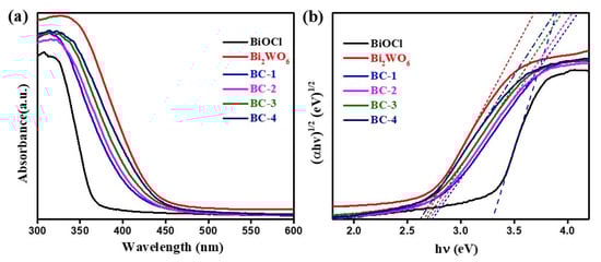 The UV-vis DRS of the samples is displayed in Figure 6a. The pure BiOCl exhibited a strong absorption in UV light regions and an absorption edge of around 370 nm, consistent with the literature reports [28,41]. Obviously, pure Bi2WO6 has an absorption edge of around 460 nm [42,43]. The Bi2WO6/BiOCl nanocomposites presented clear visible light absorption. Moreover, the absorption intensity gradually enhanced with increasing Bi2WO6 content. Furthermore, the band gap energy of the samples was studied (Figure 6b) [18,30]. The band gap energy values of pure BiOCl, Bi2WO6, BC-1, BC-2, BC-3, and BC-4 were 3.31, 2.66, 2.74, 2.68, and 2.62 eV, respectively, which demonstrates that the band gap energy of Bi2WO6/BiOCl nanocomposite decreased with the increasing content of Bi2WO6. These results demonstrate that a strong interface interaction between BiOCl and Bi2WO6 in the nanocomposites is effective to improve the visible light response.