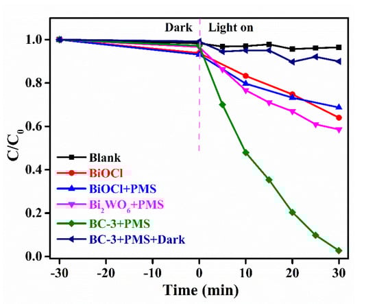 The catalytic properties of the samples were examined by BPA degradation with PMS activation. Figure 7 shows the variations in BPA concentrations under various systems. The control experiment revealed that PMS could hardly degrade the BPA molecule. The removal rates of BPA were approximately 31.1% and 41.4% by the pure BiOCl and Bi2WO6 with PMS activation under visible light irradiation, respectively. As exhibited, the removal rate of BPA reached 97.4% by BC-3 under the same condition. Obviously, the removal rate of about 10.1% demonstrates that BC-3 cannot activate the PMS molecule without light irradiation. These results suggest that BC-3 exhibits an enhancement performance in BPA degradation with PMS activation under visible light irradiation.