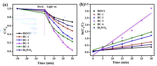 Furthermore, the effects of Bi2WO6 in the Bi2WO6/BiOCl nanocomposite on the BPA degradation with PMS activation were investigated, and the results are shown in Figure 8. As the content of Bi2WO6 increased from 0 to 75.0%, the removal efficiency firstly increased and then decreased. Notably, the BC-3 nanocomposite showed the highest photocatalytic activity for PMS activation. This can be attributed to the successful construction heterojunctions between the Bi2WO6 and BiOCl, accelerating the charge separation. However, the excessive Bi2WO6 might decrease the interface effect. The kinetic behavior of the samples for BPA degradation was investigated. The reaction kinetics could be fitted well by the principle of kinetics pseudo first-order reaction [44,45]. The rate constants for BPA degradation by BiOCl, Bi2WO6, BC-1, BC-2, BC-3, and BC-4 with PMS activation were 0.010, 0.017, 0.024, 0.040, 0.102, and 0.044 min−1, respectively. So, the BC-3 displayed better photocatalytic activity than pure BiOCl and Bi2WO6, evidencing the synergistic effect between BiOCl and Bi2WO6. These results suggest that the content of Bi2WO6 is important to optimize the catalytic activities of the nanocomposites.
